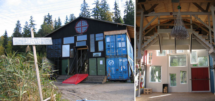 Fortunately this was overruled at higher level and the culture house has now been built by those running the initiative, some of which architectur at the Stockholm University, and the result is this: Two containers upon each other on each side support a simple wood construction. Together with large windows and a drawbridge this is practical, low price and cool. Inside a big beautiful space opens up with stairs on both sides up to a second floor.
